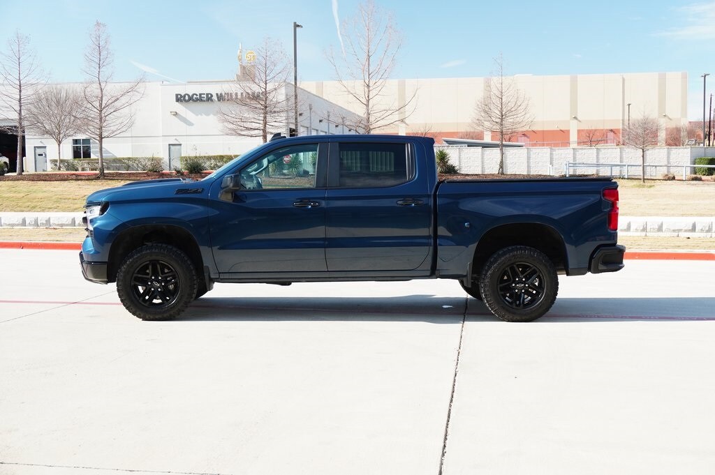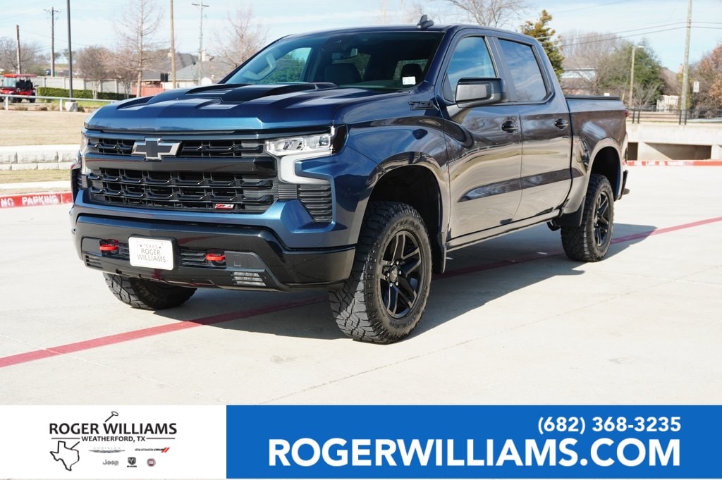 Clean CARFAX. This 2023 Chevrolet Silverado 1500 LT Trail Boss in Northsky Blue Metallic comes with the following features: EcoTec3 5.3L V8 10-Speed Automatic 4WD 10-Speed Automatic, 4WD, and Black Cloth Convenience Package (10-Way Power Driver Seat w/Lumbar, 120-Volt Bed Mounted Power Outlet, 120-Volt Instrument Panel Power Outlet, Dual Rear USB Ports (Charge Only), Dual-Zone Automatic Climate Control, Electric Rear-Window Defogger, Heated Driver & Front Outboard Passenger Seats, Heated Steering Wheel, Keyless Open & Start, Remote Vehicle Starter System, Theft Deterrent System (Unauthorized Entry), and Wrapped Steering Wheel), Preferred Equipment Group 2LT (12.3" Multicolor Reconfigurable Digital Display, 6-Speaker Audio System, All-Weather Floor Liner (LPO) (AAK), Auto-Locking Rear Differential, Bluetooth® For Phone, Chevrolet Connected Access Capable, Color-Keyed Carpeting Floor Covering, Compass, Deep-Tinted Glass, Electrical Steering Column Lock, Electronic Cruise Control, EZ Lift Power Lock & Release Tailgate, Front LED Fog Lamps, HD Rear Vision Camera, Heated Power-Adjustable Outside Mirrors, High Gloss Black Mirror Caps, Inside Rear-View Mirror w/Tilt, LED Cargo Area Lighting, OnStar & Chevrolet Connected Services Capable, Performance Red Recovery Hooks, Power Front Windows w/Driver Express Up/Down, Power Front Windows w/Passenger Express Down, Power Rear Windows w/Express Down, Rear 60/40 Folding Bench Seat (Folds Up), SiriusXM w/360L, Standard Tailgate, Steering Wheel Audio Controls, Wi-Fi Hot Spot Capable, and Wireless Phone Projection), Protection Package (Chevytec Spray-On Black Bedliner and Rear Wheelhouse Liners), Suspension Package (Heavy-Duty Air Filter and Hill Descent Control), Trailering Package (Hitch Guidance), 10-Speed Automatic, 4WD, Black Cloth, 170 Amp Alternator, 2 USB Data Ports, 220 Amp Alternator, 4-Wheel Disc Brakes, 40/20/40 Front Split-Bench Seat, 6 Speakers, ABS brakes, Air Conditioning, Alloy wheels, AM/FM radio: SiriusXM with 360L, Apple CarPlay/Android Auto, Auto High-beam Headlights, Automatic Emergency Braking, Automatic temperature control, Auxiliary External Transmission Oil Cooler, Brake assist, Cloth Seat Trim, Delay-off headlights, Driver door bin, Driver vanity mirror, Dual Exhaust w/Polished Outlets, Dual front impact airbags, Dual front side impact airbags, Electronic Stability Control, Electronic Transmission Range Selector Shifter, External Engine Oil Cooler, Floor Mounted Center Console, Following Distance Indicator, Forward Collision Alert, Front anti-roll bar, Front Bucket Seats, Front Center Armrest w/Storage, Front dual zone A/C, Front fog lights, Front License Plate Kit, Front Pedestrian Braking, Front reading lights, Front wheel independent suspension, Fully automatic headlights, Heated door mirrors, Heated front seats, Heated steering wheel, Illuminated entry, Integrated Trailer Brake Controller, IntelliBeam Automatic High Beam On/Off, Lane Keep Assist w/Lane Departure Warning, Low tire pressure warning, Multi-Flex Tailgate, Not Equipped w/Functional Cab & Bed Power Outlets, Not Equipped w/Steering Column Lock, Occupant sensing airbag, Outside temperature display, Overhead airbag, Overhead console, Panic alarm, Passenger door bin, Passenger vanity mirror, Power door mirrors, Power driver seat, Power steering, Power windows, Premium audio system: Chevrolet Infotainment 3 Premium, Radio data system, Radio: Chevrolet Infotainment 3 Premium System, Rear reading lights, Rear step bumper, Rear window defroster, Remote keyless entry, Security system, Speed control, Speed-sensing steering, Split folding rear seat, Steering wheel mounted audio controls, Tachometer, Telescoping steering wheel, Tilt steering wheel, Traction control, Trip computer, Variably intermittent wipers, Voltmeter, Wheels: 18" x 8.5" Black Painted Aluminum, and Wireless Charging.