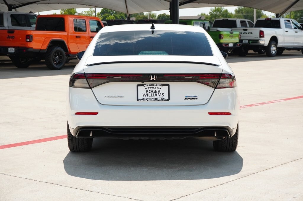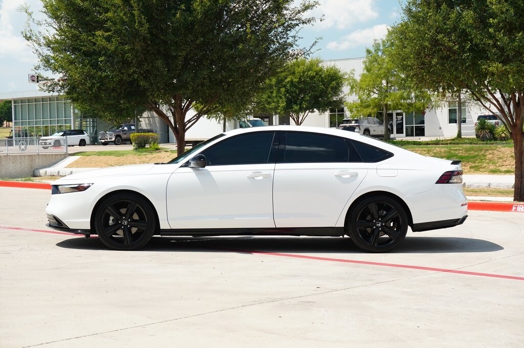 CARFAX One-Owner. Clean CARFAX. This 2023 Honda Accord Hybrid Sport-L in White comes with the following features: 2.0L 16V DOHC eCVT FWD 2.0L 16V DOHC 2.0L 16V DOHC, 4-Wheel Disc Brakes, 8 Speakers, ABS brakes, Adaptive Cruise Control: Adaptive Cruise Control (ACC) with Low-Speed Follow, Air Conditioning, Alloy wheels, AM/FM radio, Apple CarPlay/Android Auto, Auto High-beam Headlights, Automatic temperature control, Brake assist, Bumpers: body-color, Compass, Delay-off headlights, Driver door bin, Driver vanity mirror, Dual front impact airbags, Dual front side impact airbags, Electronic Stability Control, Emergency communication system: HondaLink, Exterior Parking Camera Rear, Four wheel independent suspension, Front anti-roll bar, Front Bucket Seats, Front Center Armrest, Front dual zone A/C, Front reading lights, Fully automatic headlights, Heated Front Bucket Seats, Heated front seats, Illuminated entry, Knee airbag, Lane departure: Lane Keeping Assist System (LKAS) active, Leather Shift Knob, Leather steering wheel, Leather-Trimmed Seat Trim, Low tire pressure warning, Memory seat, Occupant sensing airbag, Outside temperature display, Overhead airbag, Overhead console, Panic alarm, Passenger door bin, Passenger vanity mirror, Power door mirrors, Power driver seat, Power moonroof, Power passenger seat, Power steering, Power windows, Radio data system, Radio: 180-Watt Audio System, Rear anti-roll bar, Rear reading lights, Rear seat center armrest, Rear side impact airbag, Rear window defroster, Remote keyless entry, Security system, Speed control, Speed-sensing steering, Speed-Sensitive Wipers, Split folding rear seat, Spoiler, Steering wheel mounted audio controls, Telescoping steering wheel, Tilt steering wheel, Traction control, Trip computer, Variably intermittent wipers, and Wheels: 19" x 8.5J Matte Berlina Black.