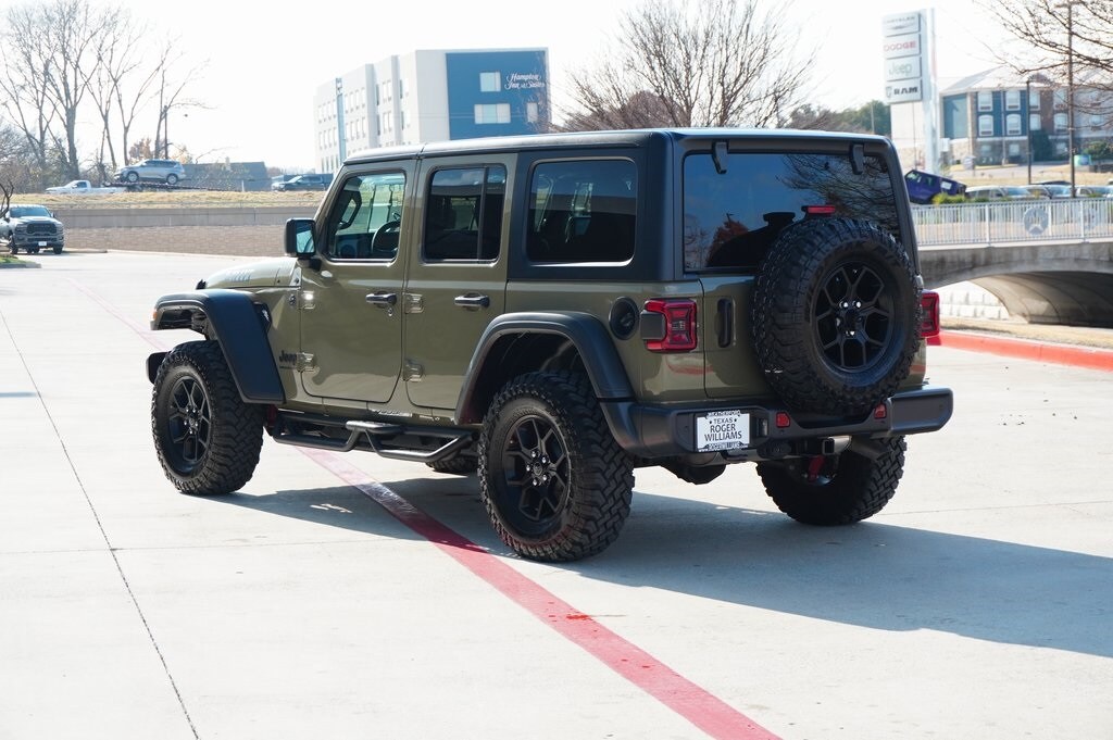 CARFAX One-Owner. Clean CARFAX. This 2025 Jeep Wrangler Willys in 41 comes with the following features: 3.6L V6 24V VVT 8-Speed Automatic 4WD Convenience Group (2-Door Passive Entry, Front Door Locks, Air Conditioning w/Auto Temperature Control, Air Filtering, Cluster 7.0" TFT Color Display, Emergency/Assistance Call, Heated Front Seats, Heated Steering Wheel, Remote Start System, and Universal Garage Door Opener), Quick Order Package 23W Willys (4-Wheel Drive Swing Gate Decal, 7 & 4 Pin Wiring Harness, 97 MPH Vehicle Max Speed Calibration, Advanced Brake Assist, Automatic Headlamps, Auxiliary Switches, Black Grille, Class II Receiver Hitch, Conventional Differential Front Axle, Corning Gorilla Glass, Dana M210 Wide HD Tube Front Axle, Dana M220 Wide Rear Axle, Daytime Running Lamps LED Accents, Deep Tint Sunscreen Windows, E-Locker Rear Axle, Enhanced Adaptive Cruise Control, Front LED Fog Lamps, Full Speed Forward Collision Warning Plus, Injection Molded Black Rear Bumper, LED Premium Reflector Headlamps, Mold In Color Bumper w/Gloss Black, Molded in Color Rubicon Highline Flare, MOPAR All-Weather Floor Mats, Off-Road Plus Mode, Power Heated Mirrors, Premium Wrapped Steering Wheel, Security Alarm, Sun Visors w/Illuminated Vanity Mirrors, Wheels: 17" x 7.5" Painted Black, Willy's Suspension, and Willys Hood Decal), Quick Order Package 24W Willys, Safety Group (Auto High Beam Headlamp Control, Blind Spot & Cross Path Detection, LED Taillamps, and ParkSense Rear Park Assist System), 110 MPH Vehicle Max Speed Calibration, 4-Wheel Disc Brakes, 8 Speakers, ABS brakes, Air Conditioning, AM/FM radio: SiriusXM, Apple CarPlay/Android Auto, Aux Battery, Black 3-Piece Hard Top, Brake assist, Cloth Low-Back Bucket Seats, Compass, Delay-off headlights, Driver door bin, Driver vanity mirror, Dual front impact airbags, Dual front side impact airbags, Electronic Stability Control, Freedom Panel Storage Bag, Front anti-roll bar, Front Bucket Seats, Front Center Armrest w/Storage, Front fog lights, Front reading lights, Illuminated entry, Integrated roll-over protection, Low tire pressure warning, Non-Lock Fuel Cap w/o Discriminator, Normal Duty Suspension, Occupant sensing airbag, Outside temperature display, Overhead airbag, Panic alarm, ParkView Rear Back-Up Camera, Passenger door bin, Passenger vanity mirror, Power steering, Power windows, Radio data system, Radio: Uconnect 5 w/12.3" Display, Rear anti-roll bar, Rear reading lights, Rear Window Defroster, Rear Window Wiper/Washer, Remote keyless entry, Speed control, Split folding rear seat, Steering wheel mounted audio controls, Stop-Start Dual Battery System, Tachometer, Telescoping steering wheel, Tilt steering wheel, Traction control, Trip computer, Variably intermittent wipers, and Wheels: 17" x 7.5" Black Steel Styled.